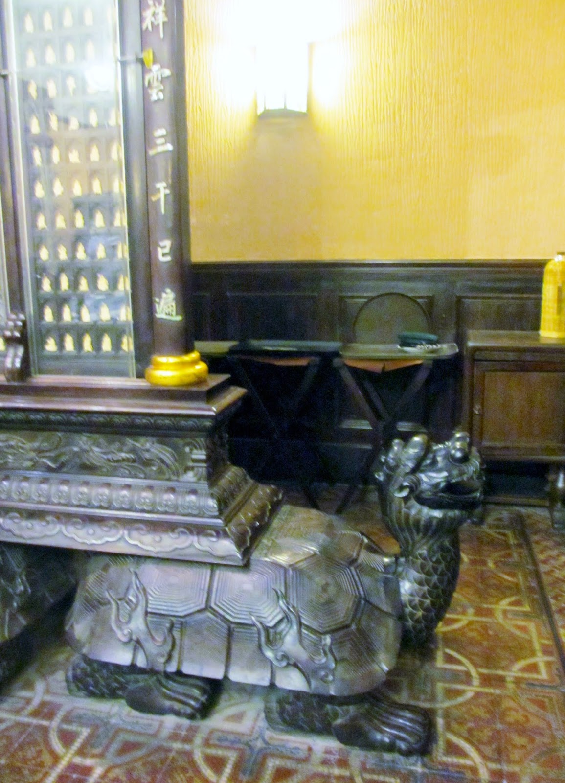 Vårt bord före och under måltiden. Skivan där i mitten fylldes med den ena rätten efter den andra och det var bara att snurra för att servera sig själv. Man försåg sig med maten med sina ätpinnar. Inga problem med att man åt och tog för sig med samma pinnar där inte...