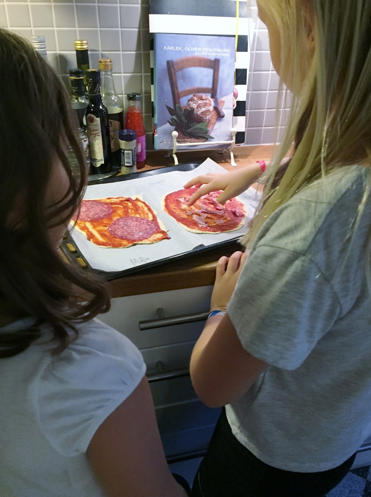 Och fredagsmys deluxe. Loppan och bästisen sattes i arbete att hjälpa till med pizzabakning och dukning. Och lagom till att pizzan togs ut ur ugnen kom kompisens mamma för att hämta dottern, men istället fick hon sätta sig till dukat bord och göra oss sällskap.
