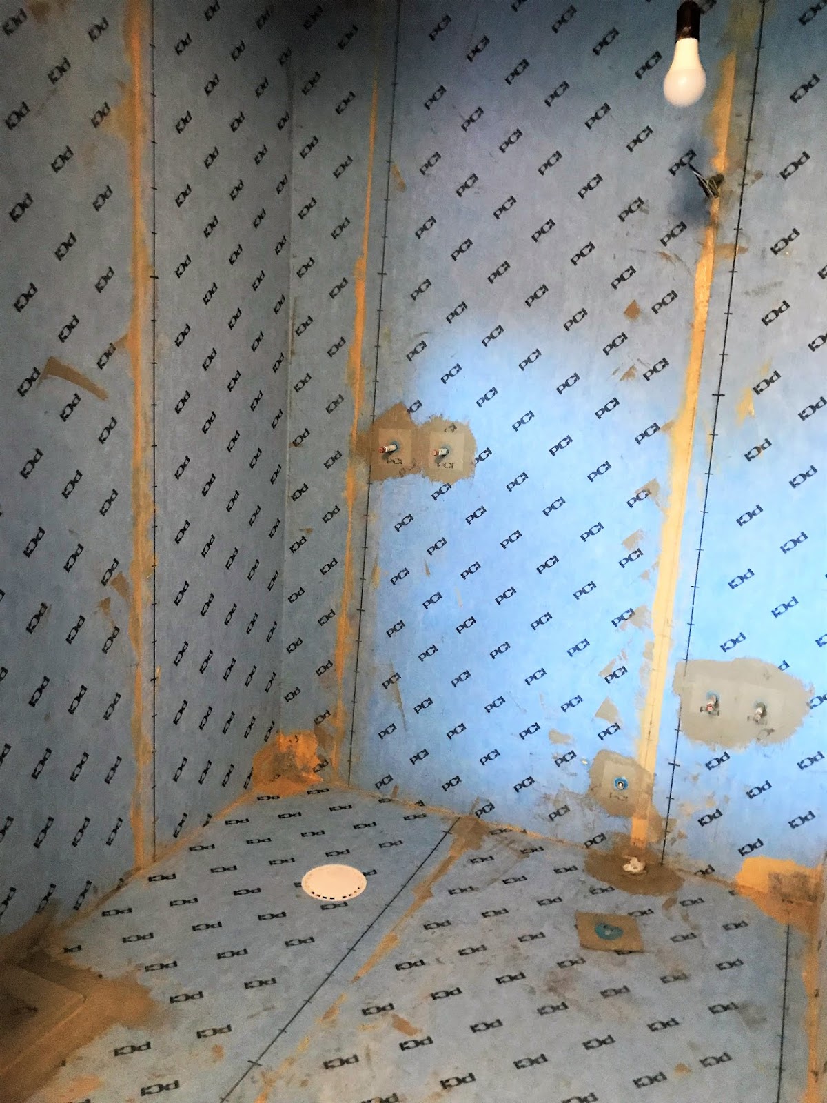 Och så här har det alltså sett ut i helgen. En ljusblå tätskyddsmatta på plats på golv och väggar. Imorgon håller vi tummarna att det är dags att plocka fram kaklet. Så pepp på att se kaklet på plats!